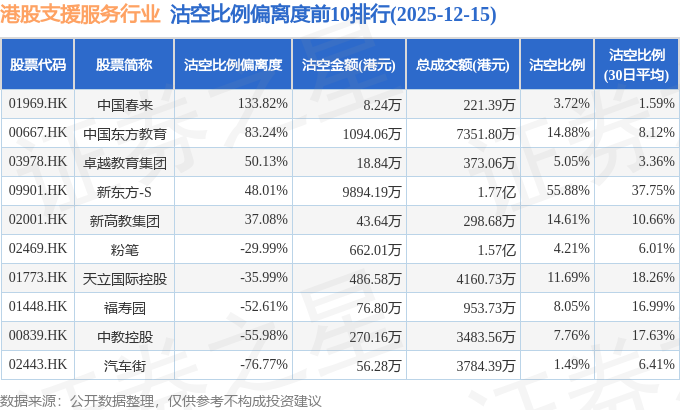 从沽空比例偏离度来看,中国春来、中国东方教育、卓越教育集团沽空比例偏离度位居行业前三,分别为133.82%、83.24%、50.13%。