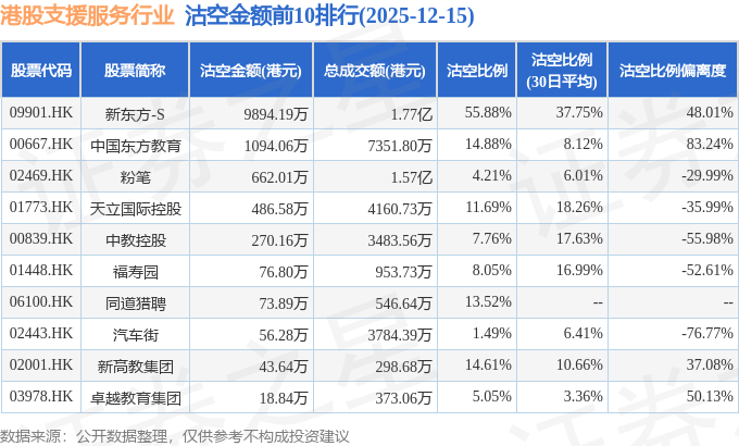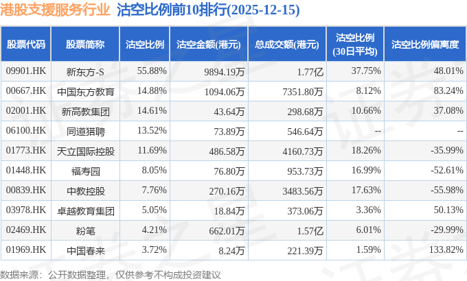 从沽空比例来看,新东方-S、中国东方教育、新高教集团沽空比例位居行业前三,分别为55.88%、14.88%、14.61%。