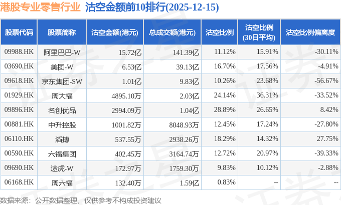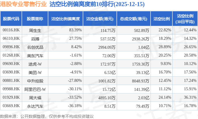 由于港股人民币柜台交易股票成交金额较小,沽空比例普遍偏高,为了避免干扰,已将人民币柜台交易股票从排行表格中剔除。