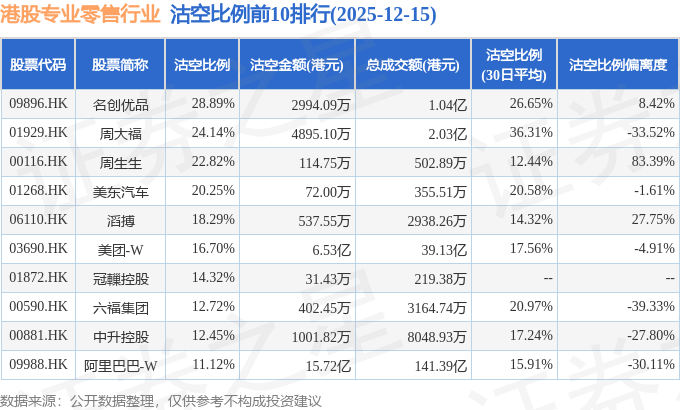 从沽空比例来看,名创优品、周大福、周生生沽空比例位居行业前三,分别为28.89%、24.14%、22.82%。