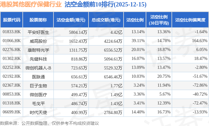 从沽空金额来看,平安好医生、威高股份、康耐特光学沽空金额位居行业前三,分别为5804.14万港元、1652.43万港元、1311.75万港元。