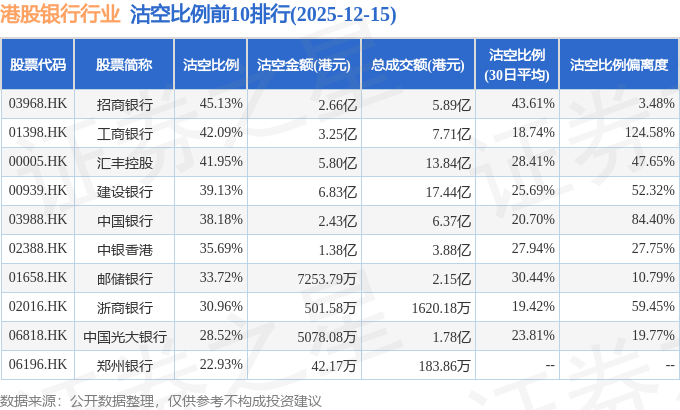 从沽空比例来看,招商银行、工商银行、汇丰控股沽空比例位居行业前三,分别为45.13%、42.09%、41.95%。