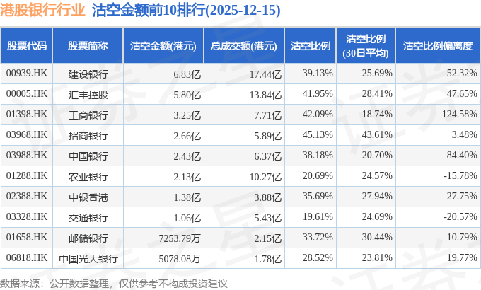 证券之星消息,12月15日港交所披露数据显示,当日港股银行行业的40只个股中有25只被沽空,总沽空股数为3.09亿股,总沽空金额为27.89亿元(港元),而当日银行行业的总成交金额为83.36亿元(港元),沽空比例为33.46%。当日银行行业总体跌0.78%。