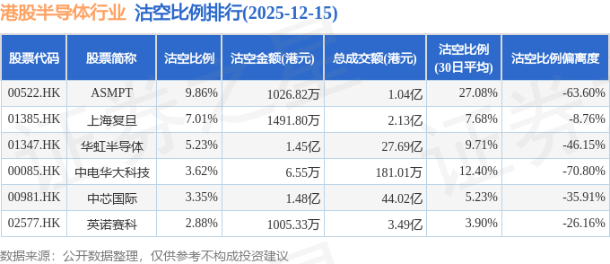 从沽空比例来看,ASMPT、上海复旦、华虹半导体沽空比例位居行业前三,分别为9.86%、7.01%、5.23%。