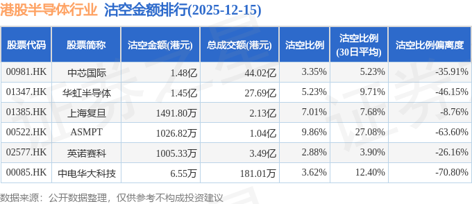 从沽空金额来看,中芯国际、华虹半导体、上海复旦沽空金额位居行业前三,分别为1.48亿港元、1.45亿港元、1491.8万港元。