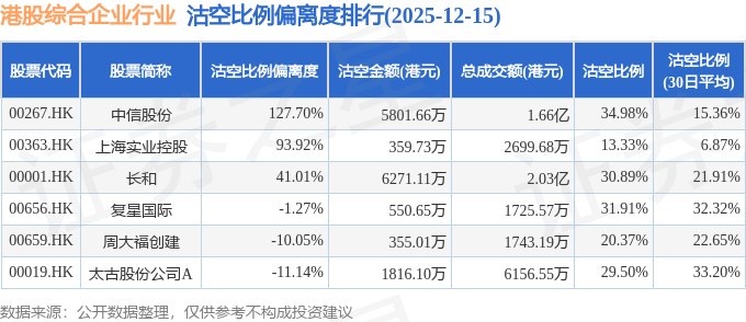 从沽空比例偏离度来看,中信股份、上海实业控股、长和沽空比例偏离度位居行业前三,分别为127.7%、93.92%、41.01%。