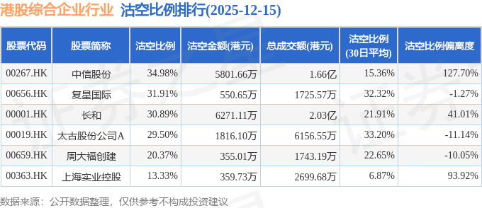 从沽空比例来看,中信股份、复星国际、长和沽空比例位居行业前三,分别为34.98%、31.91%、30.89%。