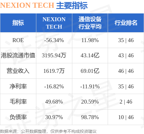NEXION TECH港股市值3195.94万港元,在通信设备行业中排名第43。主要指标见下表: