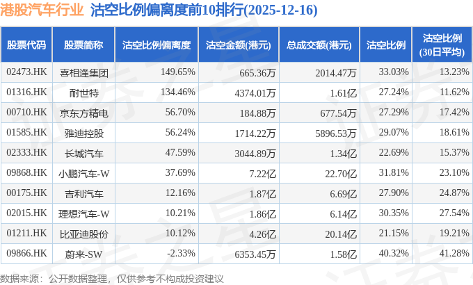 从沽空比例来看,蔚来-SW、喜相逢集团、小鹏汽车-W沽空比例位居行业前三,分别为40.32%、33.03%、31.81%。