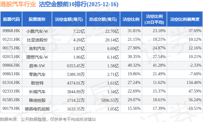 从沽空金额来看,小鹏汽车-W、比亚迪股份、吉利汽车沽空金额位居行业前三,分别为7.22亿港元、4.26亿港元、1.87亿港元。