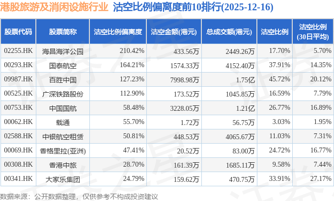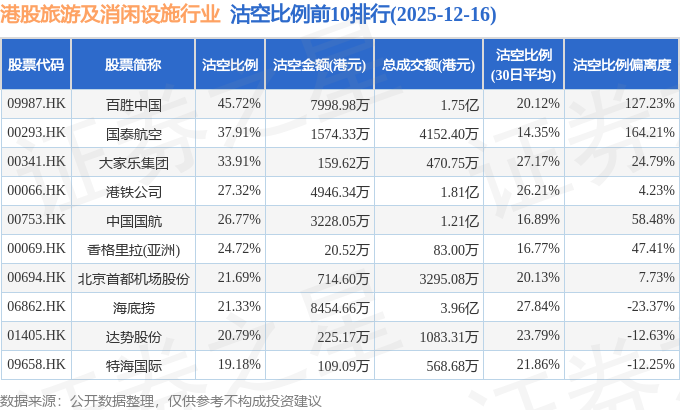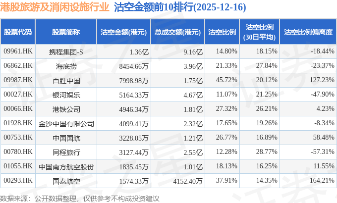 证券之星消息,12月16日港交所披露数据显示,当日港股旅游及消闲设施行业的135只个股中有34只被沽空,总沽空股数为4338.95万股,总沽空金额为6.07亿元(港元),而当日旅游及消闲设施行业的总成交金额为37.73亿元(港元),沽空比例为16.08%。当日旅游及消闲设施行业总体跌1.08%。