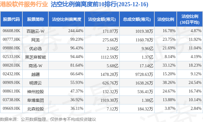 从沽空比例偏离度来看,百融云-W、网龙、优必选沽空比例偏离度位居行业前三,分别为244.44%、99.23%、96.43%。