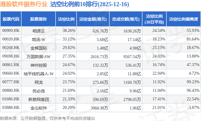 从沽空比例来看,明源云、商汤-W、金蝶国际沽空比例位居行业前三,分别为38.26%、33.12%、29.82%。