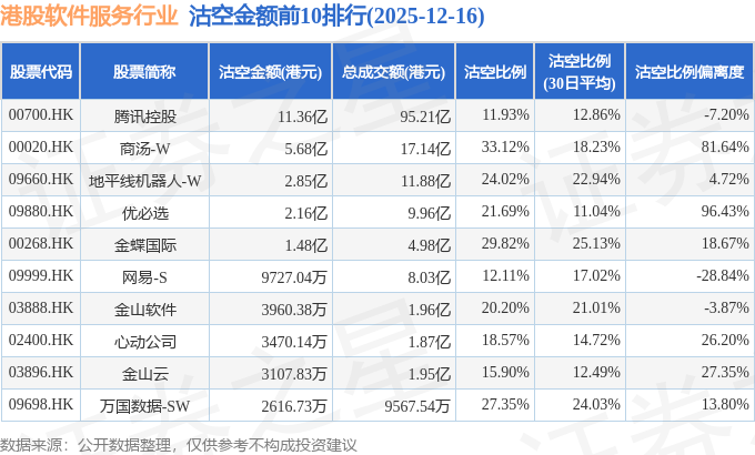 从沽空金额来看,腾讯控股、商汤-W、地平线机器人-W沽空金额位居行业前三,分别为11.36亿港元、5.68亿港元、2.85亿港元。