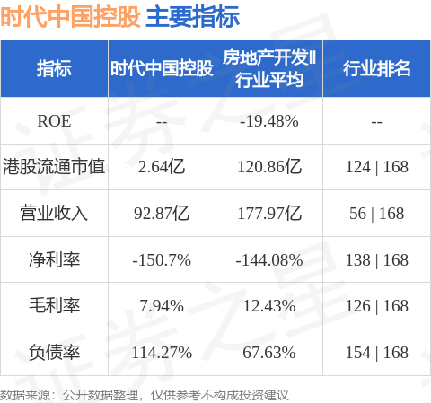 时代中国控股港股市值2.64亿港元,在房地产开发Ⅱ行业中排名第124。主要指标见下表: