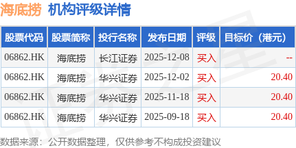 投行对该股的评级以买入为主,近90天内共有4家投行给出买入评级,近90天的目标均价为20.4港元。长江证券最新一份研报给予海底捞买入评级。