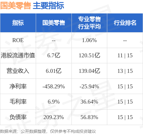 国美零售港股市值6.7亿港元,在专业零售行业中排名第11。主要指标见下表: