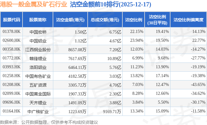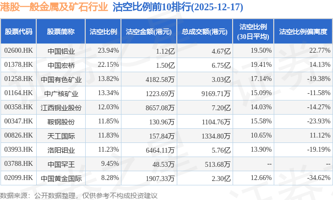 从沽空比例来看,中国铝业、中国宏桥、中国有色矿业沽空比例位居行业前三,分别为23.94%、22.15%、13.82%。