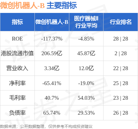 微创机器人-B港股市值206.59亿港元,在医疗器械Ⅱ行业中排名第2。主要指标见下表:
