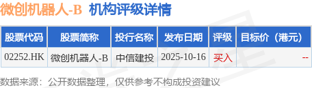 投行对该股的评级以买入为主,近90天内共有1家投行给出买入评级。中信建投最新一份研报给予微创机器人-B买入评级。