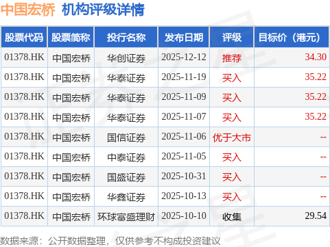 投行对该股的评级以买入为主,近90天内共有6家投行给出买入评级,近90天的目标均价为33.9港元。华创证券最新一份研报给予中国宏桥推荐评级,目标价34.3港元。
