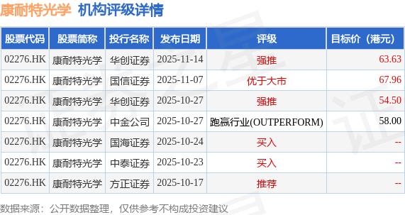 截至2025年12月18日收盘,康耐特光学-一百(02276.HK)报收于51.85港元,下跌2.63%,成交量105.46万股,成交额5446.43万港元。投行对该股的评级以强推为主,近90天内共有2家投行给出强推评级,近90天的目标均价为61.02港元。华创证券最新一份研报给予康耐特光学强推评级,目标价63.63港元。