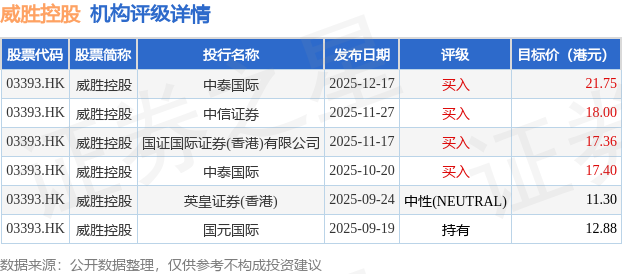 截至2025年12月18日收盘,威胜控股(03393.HK)报收于16.35港元,下跌0.61%,成交量220.13万股,成交额3594.76万港元。投行对该股的评级以买入为主,近90天内共有4家投行给出买入评级,近90天的目标均价为16.45港元。中泰国际最新一份研报给予威胜控股买入评级,目标价21.75港元。