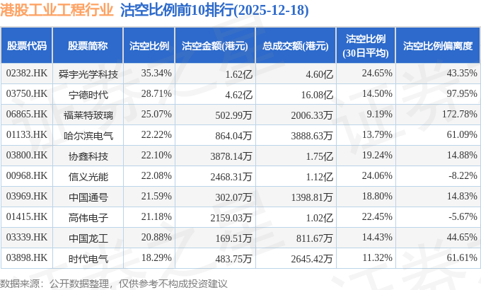 从沽空比例来看,舜宇光学科技、宁德时代、福莱特玻璃沽空比例位居行业前三,分别为35.34%、28.71%、25.07%。