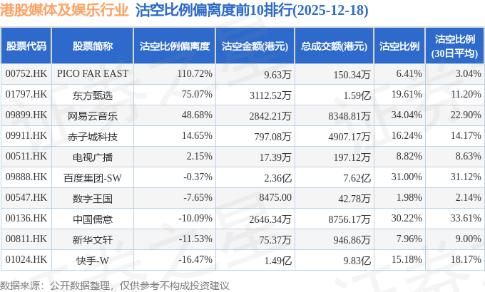 从沽空比例偏离度来看,PICO FAR EAST、东方甄选、网易云音乐沽空比例偏离度位居行业前三,分别为110.72%、75.07%、48.68%。