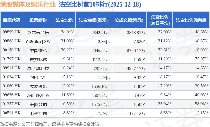 从沽空比例来看,网易云音乐、百度集团-SW、中国儒意沽空比例位居行业前三,分别为34.04%、31%、30.22%。