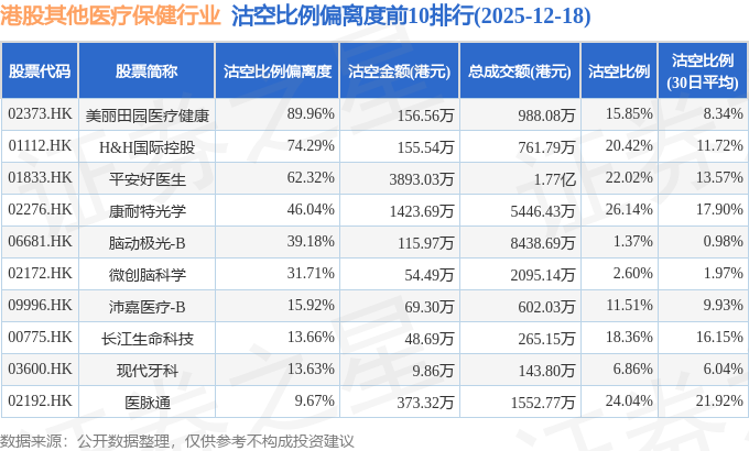 从沽空比例偏离度来看,美丽田园医疗健康、H&H国际控股、平安好医生沽空比例偏离度位居行业前三,分别为89.96%、74.29%、62.32%。