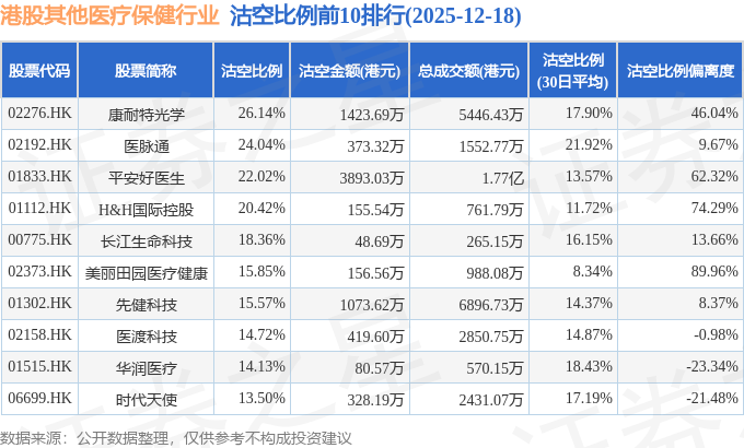 从沽空比例来看,康耐特光学、医脉通、平安好医生沽空比例位居行业前三,分别为26.14%、24.04%、22.02%。