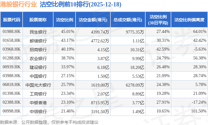 从沽空比例来看,民生银行、邮储银行、招商银行沽空比例位居行业前三,分别为45.01%、43.17%、40.19%。