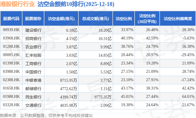 从沽空金额来看,建设银行、招商银行、农业银行沽空金额位居行业前三,分别为6.18亿港元、4.15亿港元、3.87亿港元。