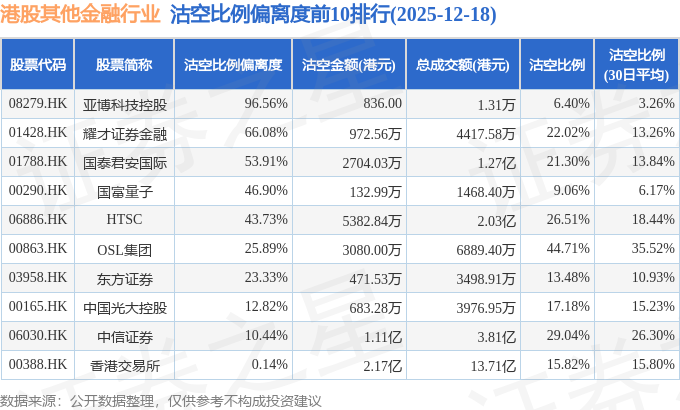 从沽空比例偏离度来看,亚博科技控股、耀才证券金融、国泰君安国际沽空比例偏离度位居行业前三,分别为96.56%、66.08%、53.91%。