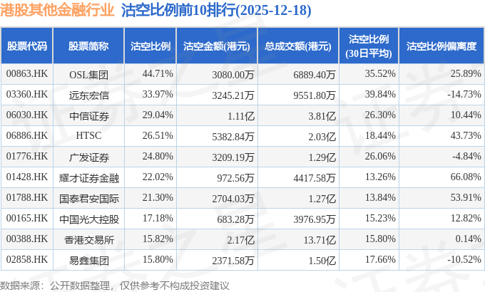 从沽空比例来看,OSL集团、远东宏信、中信证券沽空比例位居行业前三,分别为44.71%、33.97%、29.04%。