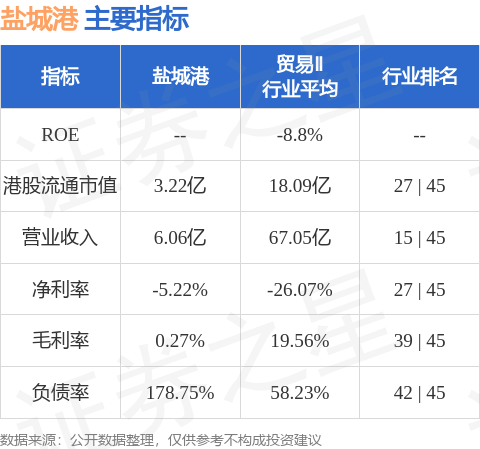盐城港港股市值3.22亿港元,在贸易Ⅱ行业中排名第27。主要指标见下表: