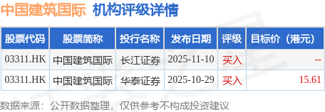 截至2025年12月19日收盘,中国建筑国际(03311.HK)报收于9.26港元,下跌0.32%,成交量453.7万股,成交额4199.48万港元。投行对该股的评级以买入为主,近90天内共有2家投行给出买入评级,近90天的目标均价为15.61港元。长江证券最新一份研报给予中国建筑国际买入评级。