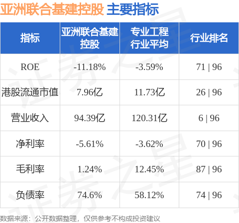 亚洲联合基建控股港股市值7.96亿港元,在专业工程行业中排名第26。主要指标见下表: