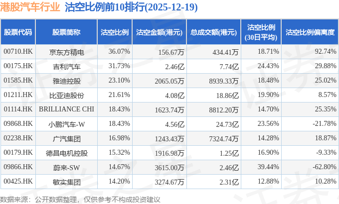 从沽空比例偏离度来看,京东方精电、吉利汽车、BRILLIANCE CHI沽空比例偏离度位居行业前三,分别为92.74%、29.88%、25.35%。