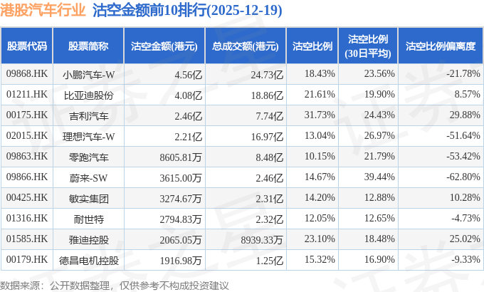 从沽空金额来看,小鹏汽车-W、比亚迪股份、吉利汽车沽空金额位居行业前三,分别为4.56亿港元、4.08亿港元、2.46亿港元。