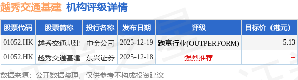 中金发布研报称 ,因越秀交通基建(01052.HK)收购尚未落地,维持2025/26年净利润分别为7.39 /7.70亿元。当前股价对应2025/2026年9.5/9.0倍P/E。维持跑赢行业评级,考虑到近期市场风险偏好上行,市场应给予一定的估值溢价(也就是可以交易到比行业更低的股息率),以5.5%这一股息率水平对应其2025年目标价为5.13港元,对应2026年5.8%的股息率。该行上调目标价18.2%,对应2025/26年P/E分别为10.6和10.1倍,较当前股价有12.2%的上行空间。