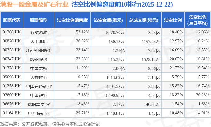 从沽空比例偏离度来看,五矿资源、天工国际、江西铜业股份沽空比例偏离度位居行业前三,分别为53.12%、26.62%、23.14%。