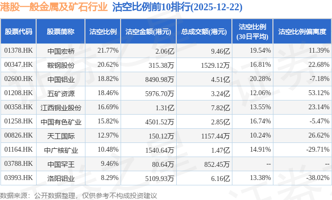 从沽空比例来看,中国宏桥、鞍钢股份、中国铝业沽空比例位居行业前三,分别为21.77%、20.62%、18.82%。