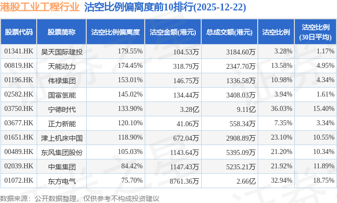 从沽空比例偏离度来看,昊天国际建投、天能动力、伟禄集团沽空比例偏离度位居行业前三,分别为179.55%、174.45%、153.01%。