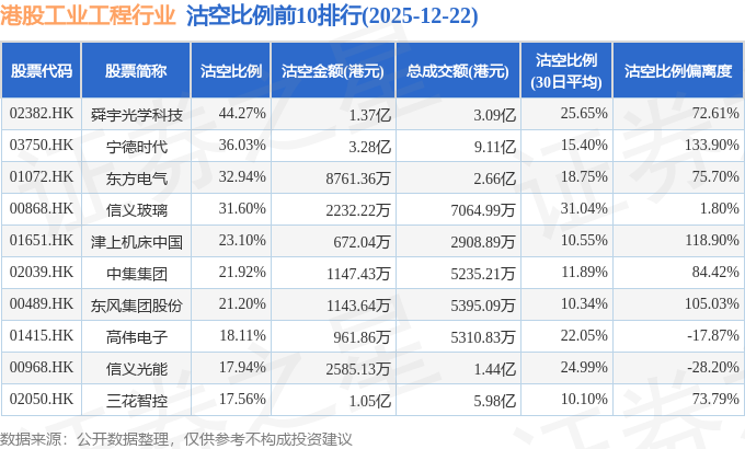 从沽空比例来看,舜宇光学科技、宁德时代、东方电气沽空比例位居行业前三,分别为44.27%、36.03%、32.94%。