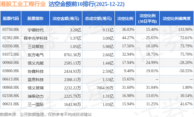 从沽空金额来看,宁德时代、舜宇光学科技、三花智控沽空金额位居行业前三,分别为3.28亿港元、1.37亿港元、1.05亿港元。