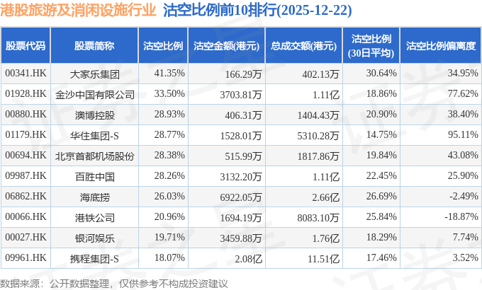 证券之星消息,12月22日港交所披露数据显示,当日港股旅游及消闲设施行业的134只个股中有34只被沽空,总沽空股数为2664.39万股,总沽空金额为5.41亿元(港元),而当日旅游及消闲设施行业的总成交金额为43.59亿元(港元),沽空比例为12.41%。当日旅游及消闲设施行业总体涨0.79%。