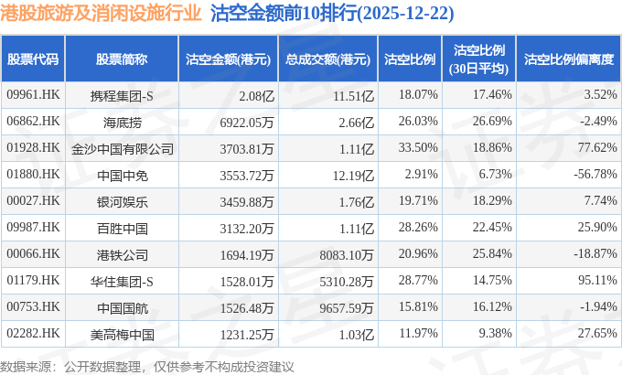 从沽空金额来看,携程集团-S、海底捞、金沙中国有限公司沽空金额位居行业前三,分别为2.08亿港元、6922.05万港元、3703.81万港元。