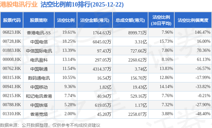 从沽空比例来看,香港电讯-SS、中国电信、中信国际电讯沽空比例位居行业前三,分别为19.61%、18.25%、13.39%。